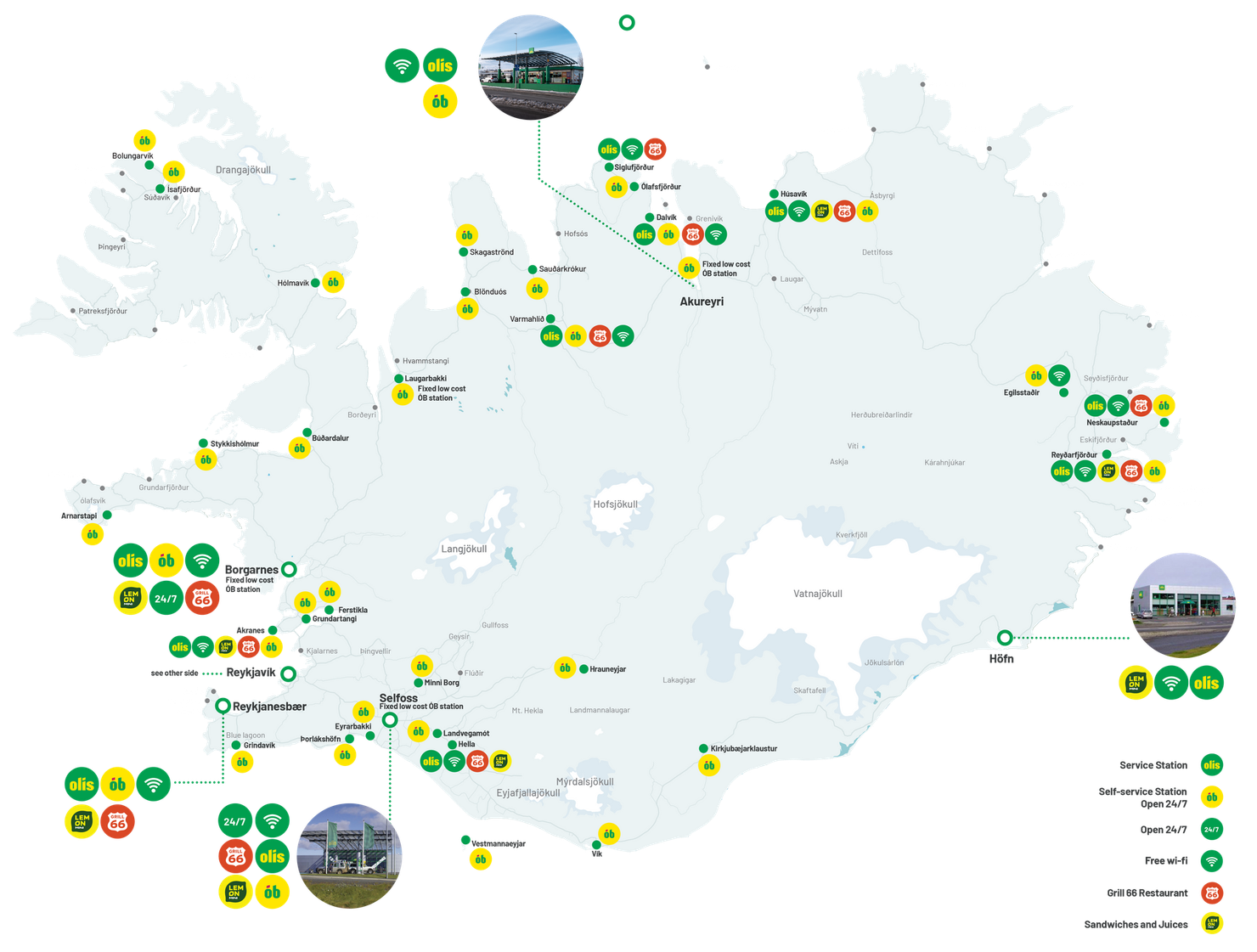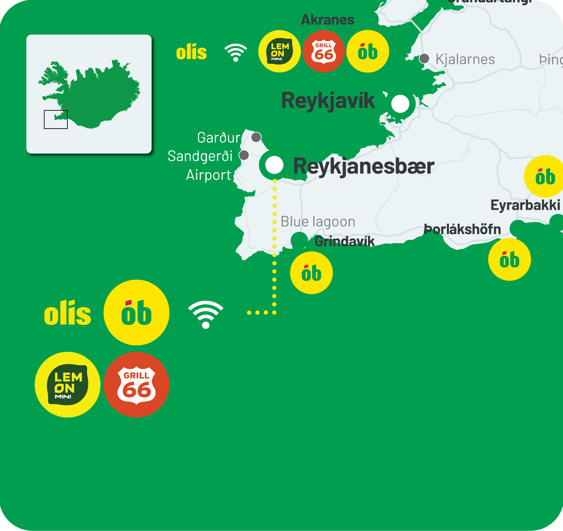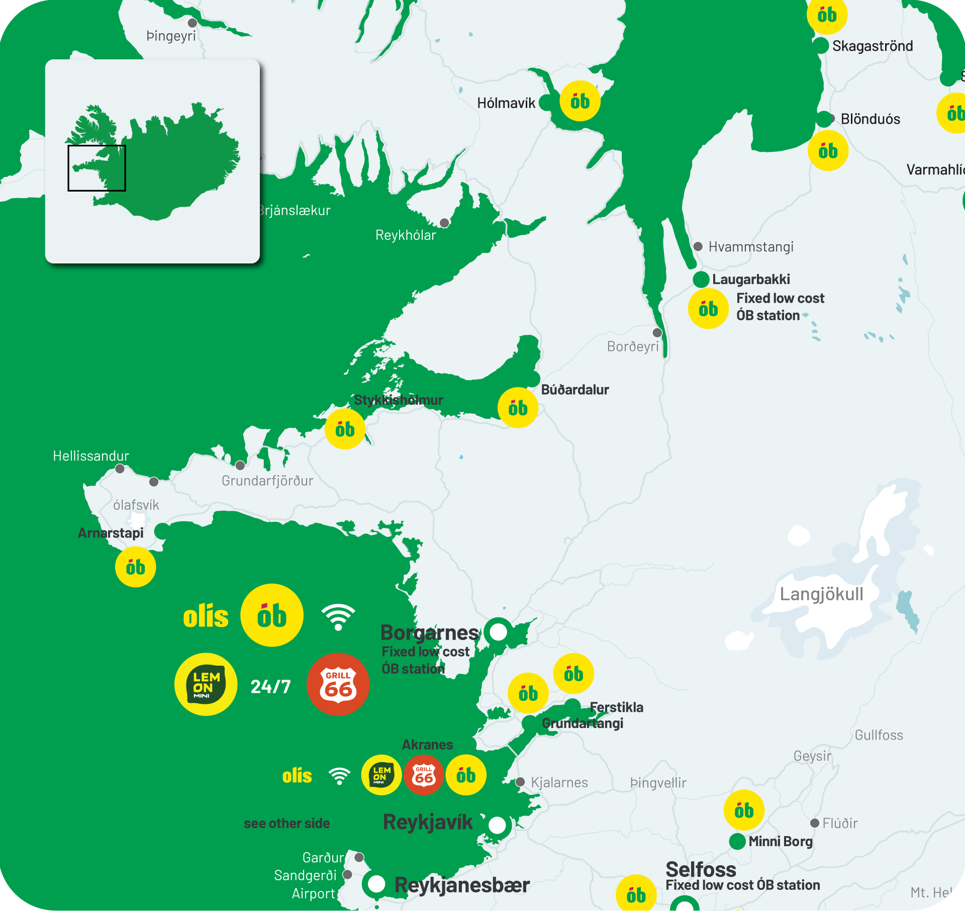ÓB is our network of low-priced, self-service fuel stations, conveniently located in 45 spots around Iceland and open 24/7.