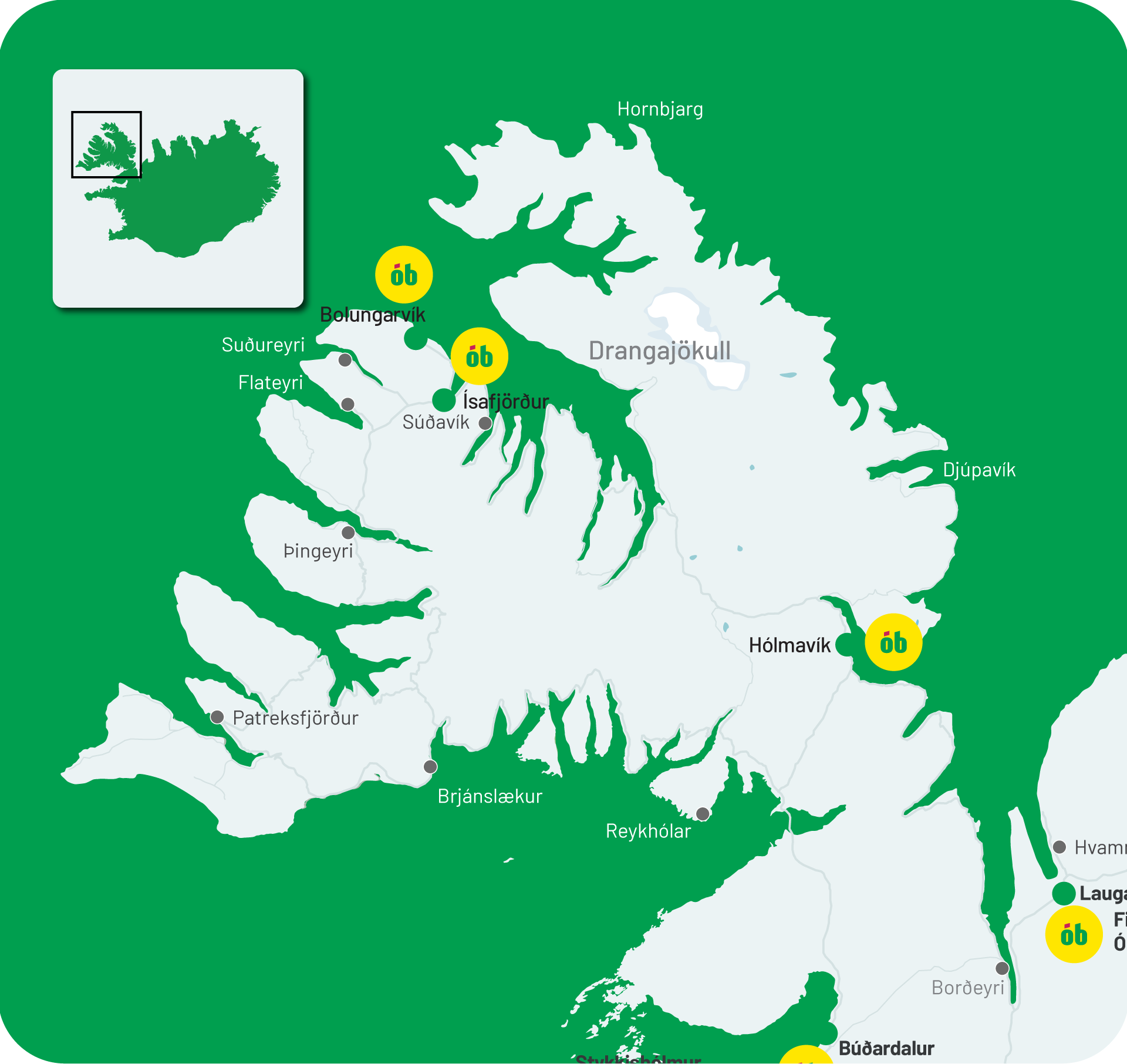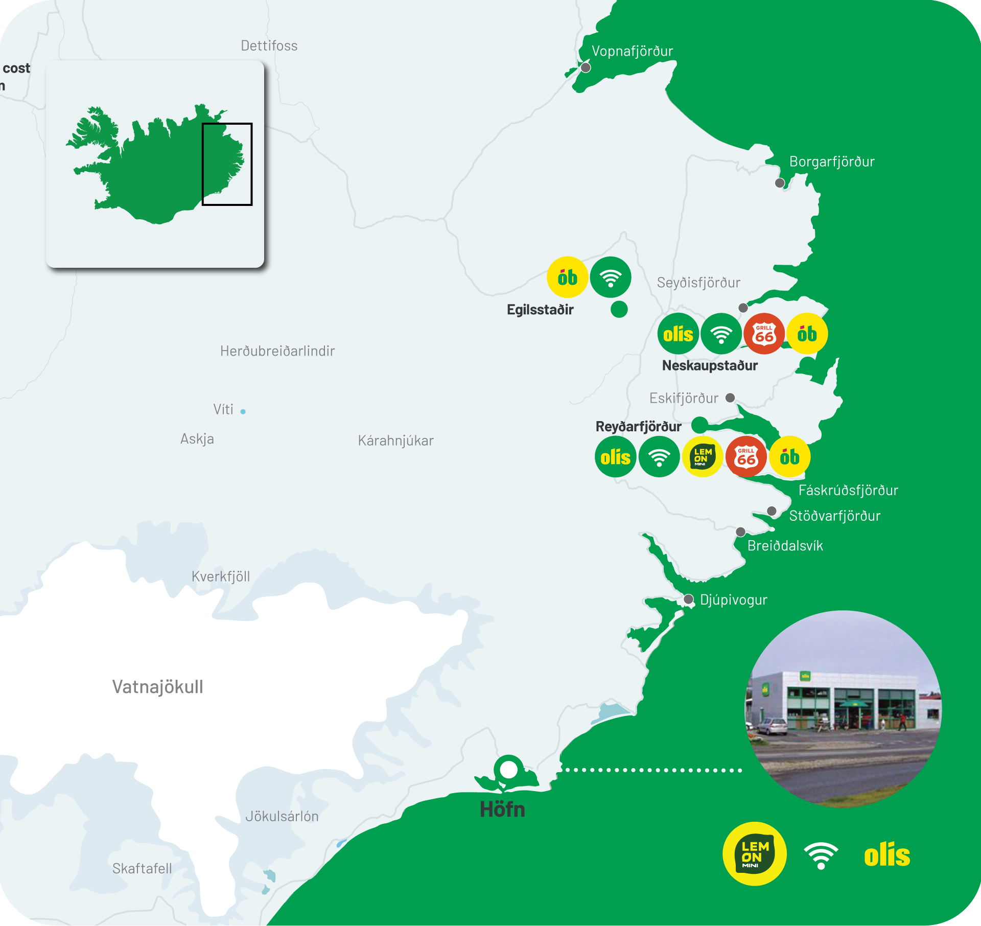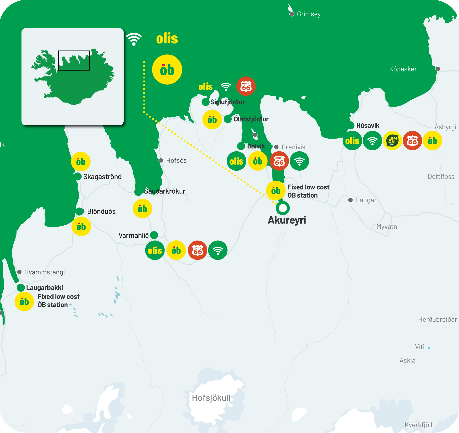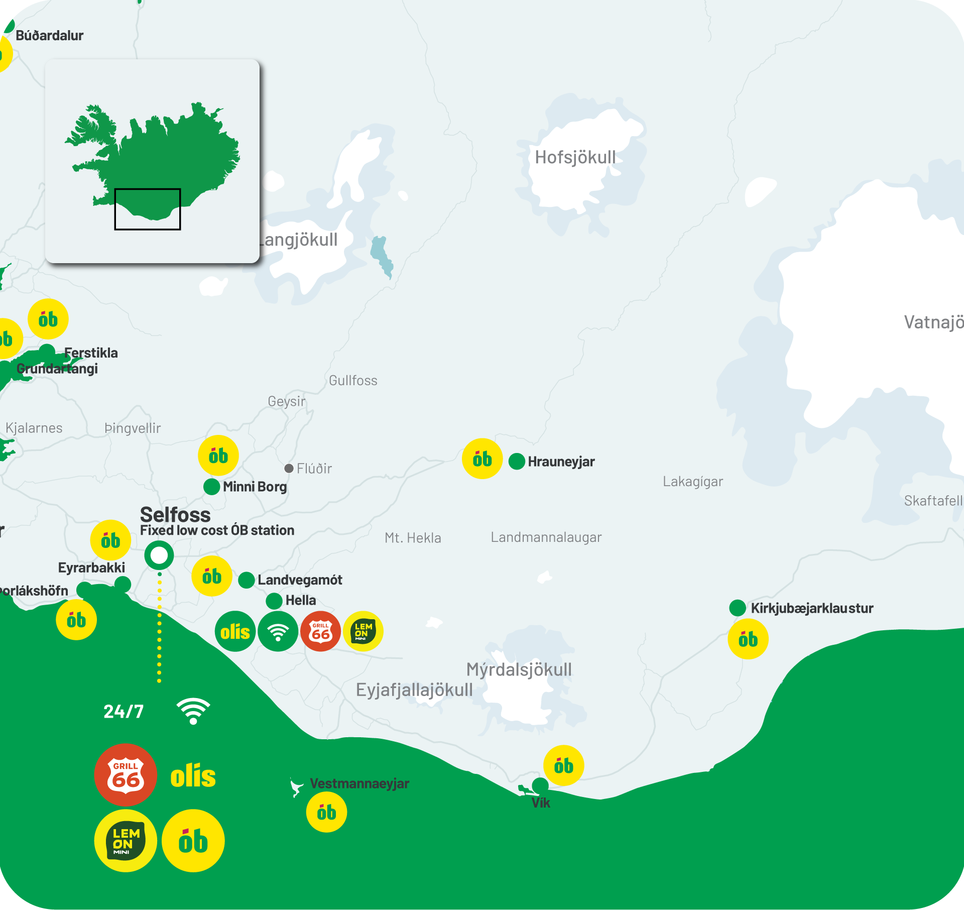 ÓB is our network of low-priced, self-service fuel stations, conveniently located in 45 spots around Iceland and open 24/7.